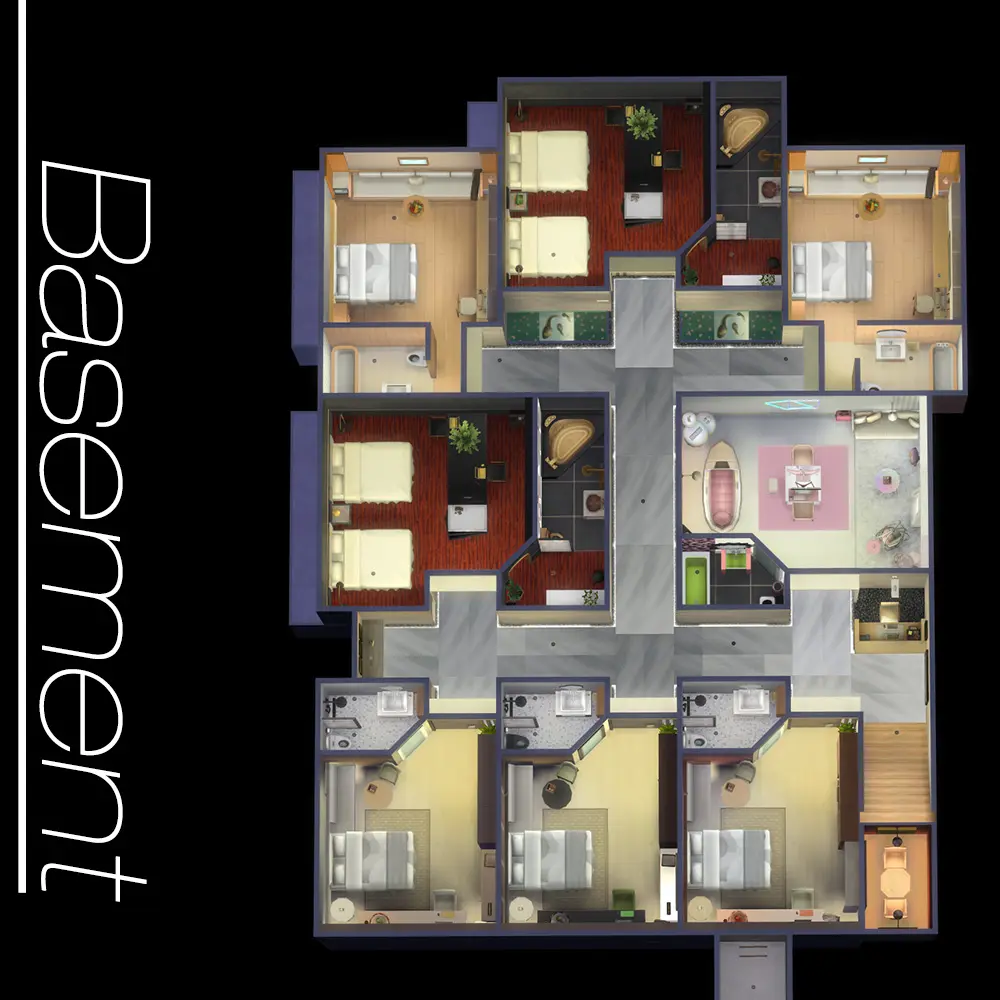 二楼楼顶只有泳池,见平面图~ 从这里可以下山,外面的人也可以进来,所以通往二楼顶的门边有个警报器 地下是8个客房 标准间X3